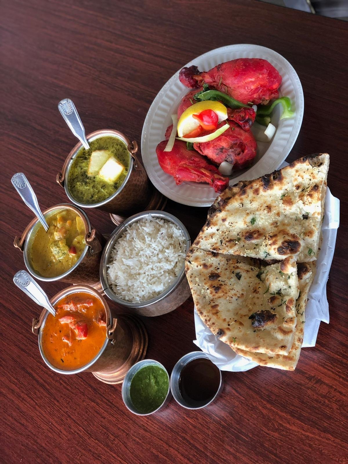 Rice, naan, saag paneer, chana masala, vegetable samosa, Dessert - choose from Kheer or Gulab Jamun