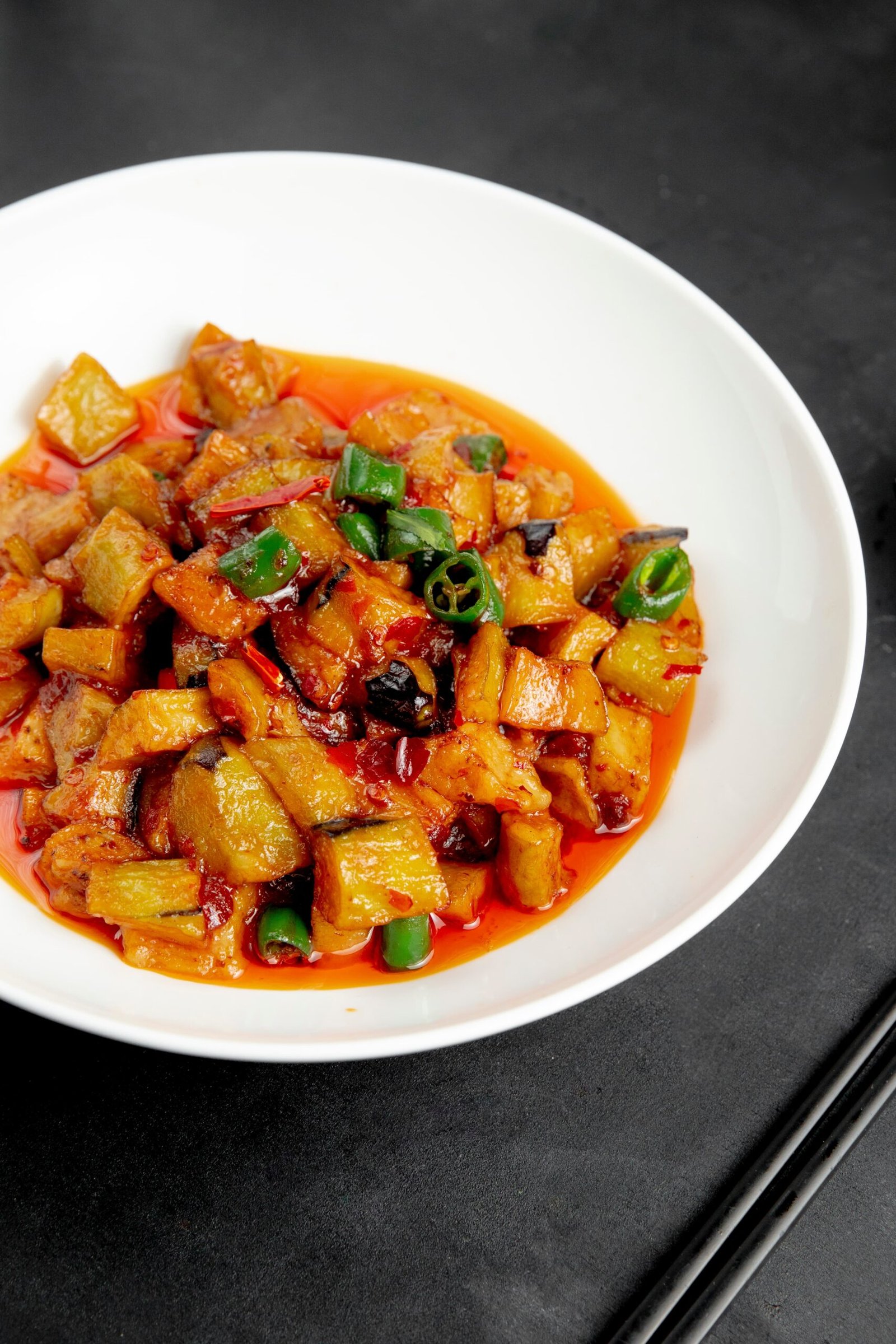 Potatoes and tofu cooked in flavorful gravy