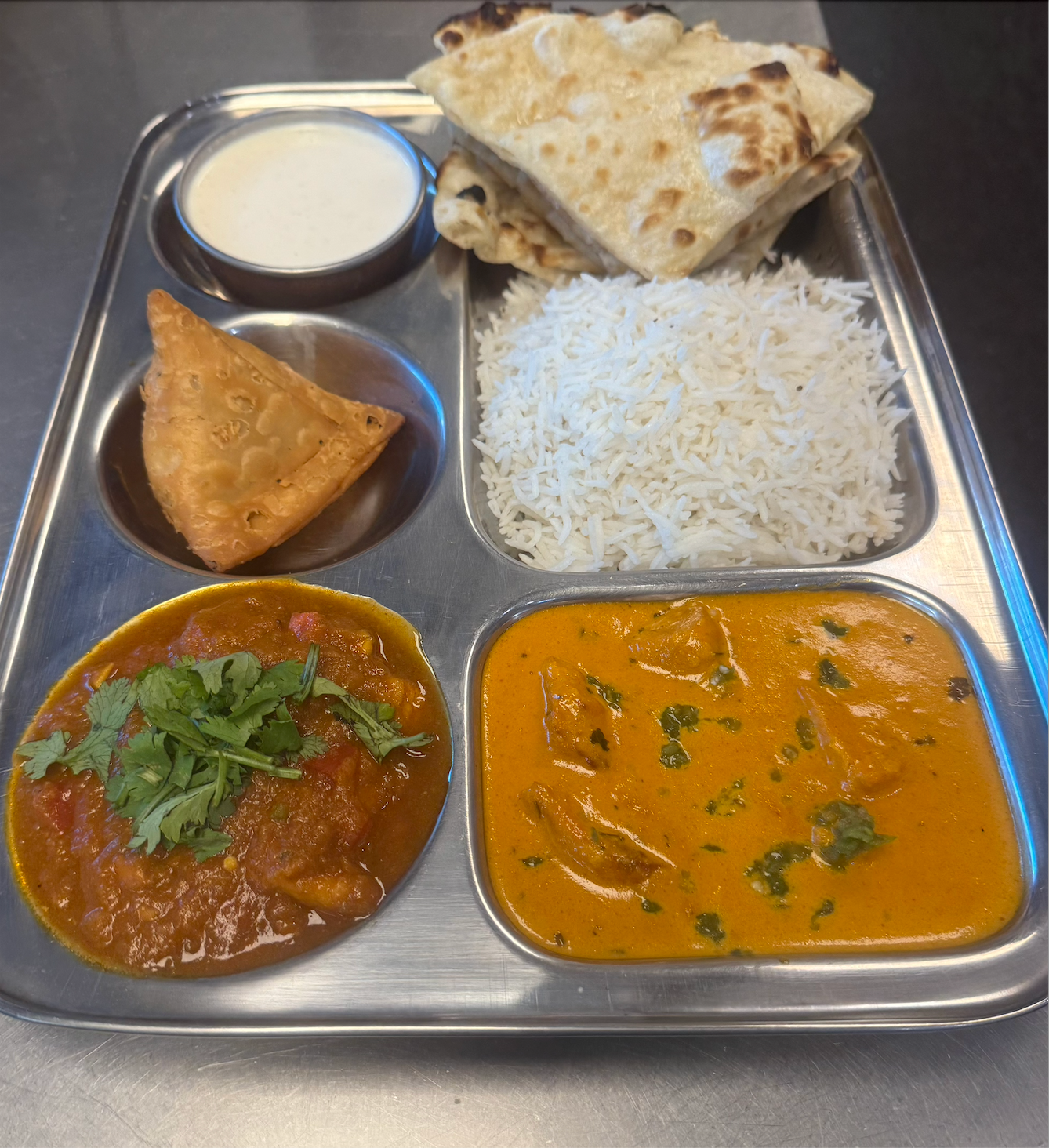 Rice, naan, chicken makhanwala, chicken curry, vegetable samosa, Dessert - choose from Kheer or Gulab Jamun